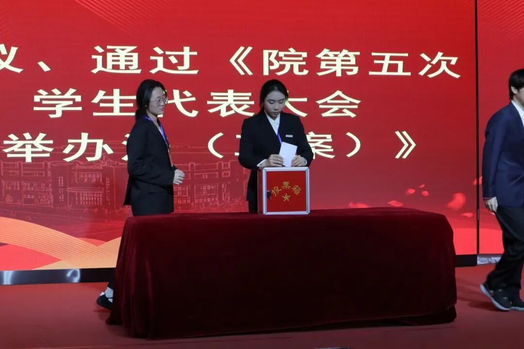 在监票人、计票人的严格监督与规范履职下,本次选举以无记名投票、差额选举的方式有序开展。代表们郑重投下神圣一票,最终顺利选举产生新一届院学生会主席团成员。