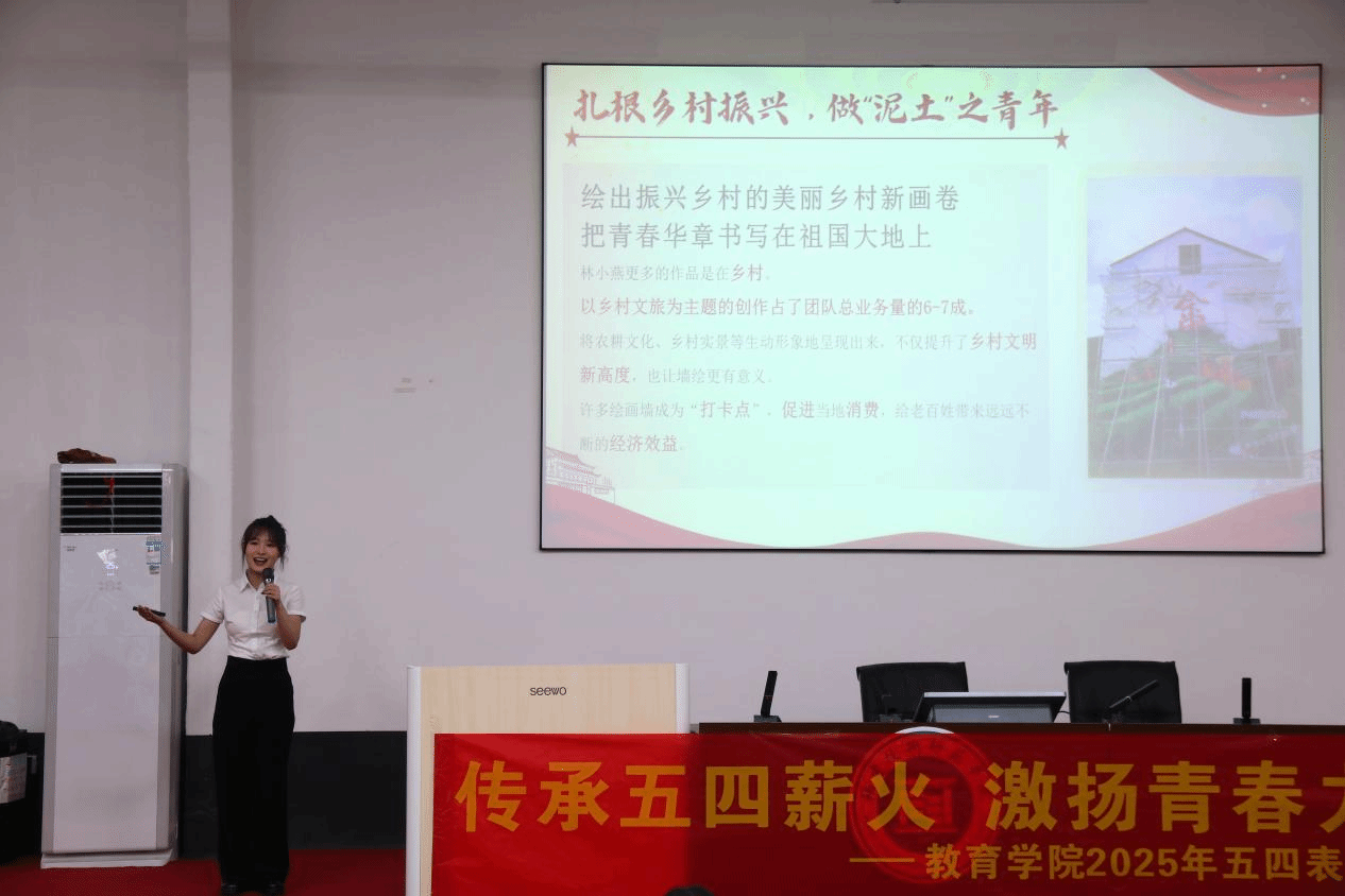 在微团课宣讲环节,2024级学前教育2班范思雨同学以《争做三味青年 彰显青春担当》为题,呼吁同学们以“三味青年”为目标,勇于担当时代使命;2022级学前教育1班叶娟同学则以《传承先辈精神 坚定理想信念》为主题,激励大家传承五四精神,为理想不懈奋斗。两位同学的精彩演讲引发了在场师生的强烈共鸣。
