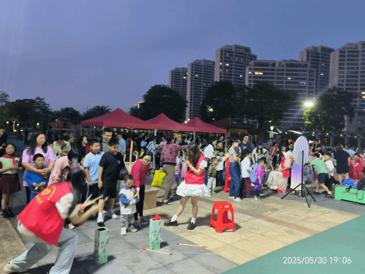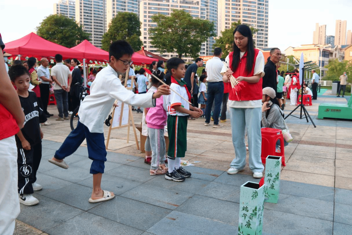 游戏互动区欢声雷动:投壶箭筒叮当作响,“射五毒”寄托安康祈愿,灵巧的“夹蜜豆”和妙趣横生的“钓粽子”比赛吸引亲子家庭踊跃参与,童趣之中渗透古老仪式的文化基因。