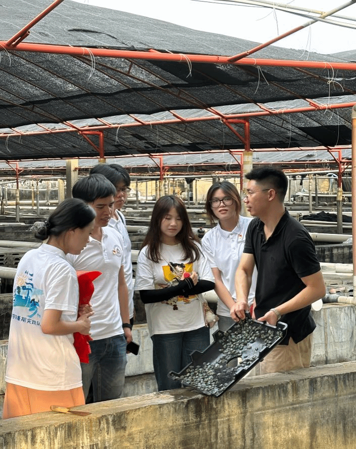 实践队走进宫前鲍鱼养殖场,这里是东山海洋产业的鲜活缩影,养殖池整齐排列,鲍鱼、海马自在游动。队员与养殖管理人员交流,了解鲍鱼、海马养殖及生殖细节,关注市场行情,倾听养殖面临的自然灾害与成本挑战。交流中,队员感受到养殖户的信心决心,看到科技创新助力产业升级。值得一提的是,学前教育专业的队员们发挥创意,将养殖场里废弃的鲍鱼壳作为传播东山红色文化与海洋生态的独特载体,精心绘制红色地标与生态景观,把东山红色故事、革命精神与海洋元素巧妙融合,以实际行动传承和弘扬爱国主义精神。