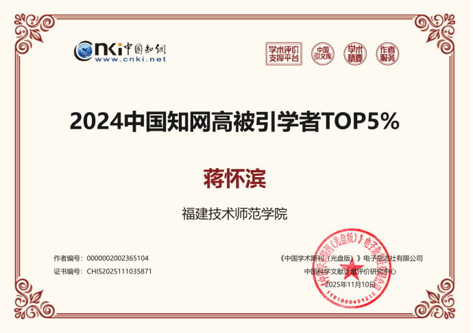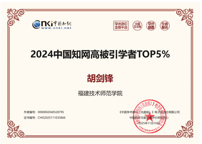 近日,中国知网下属的中国科学文献计量评价研究中心基于中国知网收录的国内学术成果开展了学者学术影响力客观评价。经过定量数据统计、遴选方案评审等前期筹备工作,知网评价中心遴选并发布了“2024 中国知网高被引学者”名单。我院胡剑锋、蒋怀滨两位教师成功入选“高被引学者TOP5%”。