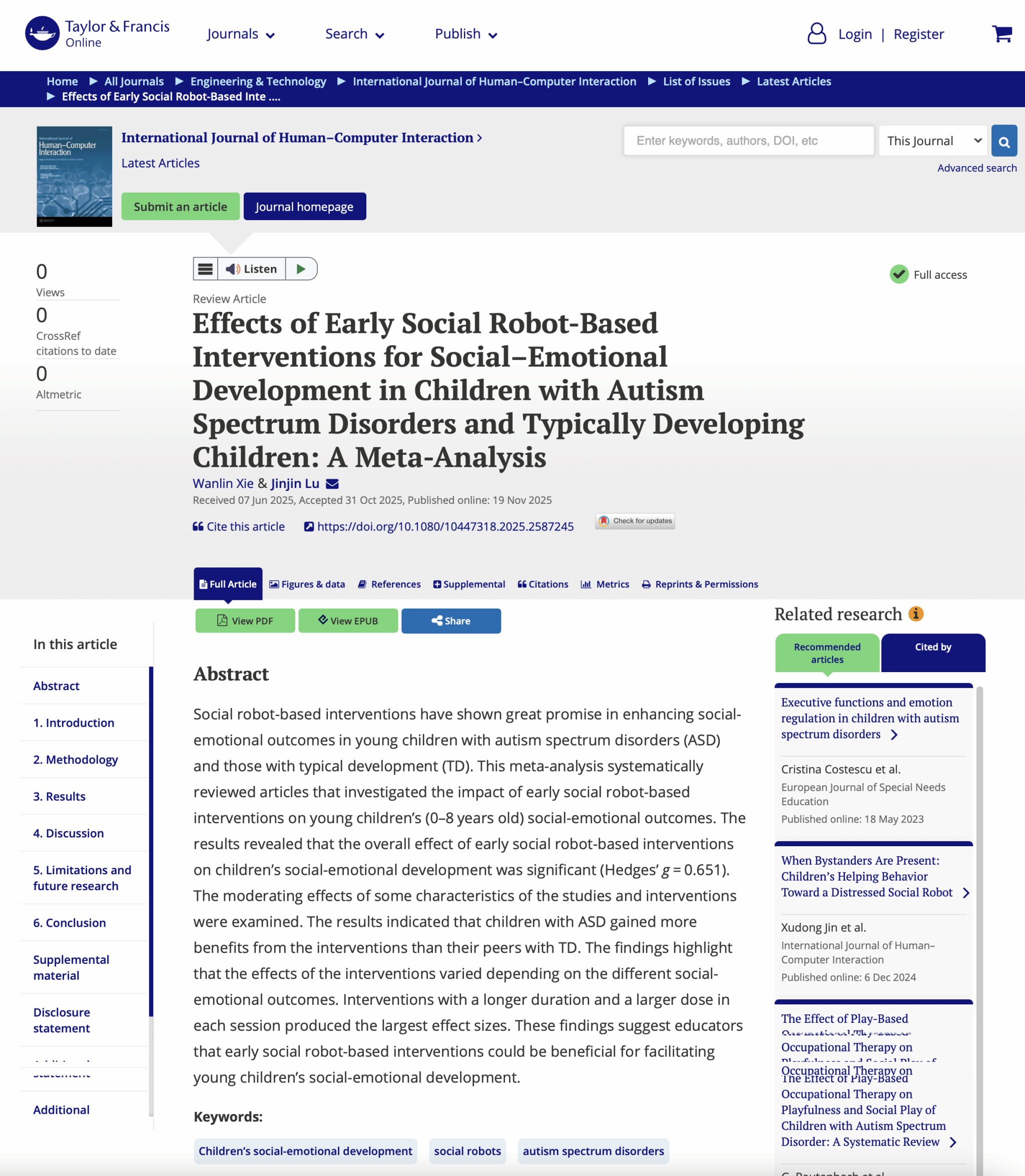 近日,我院青年教师谢婉琳以第一作者身份在计算机与人机交互领域国际知名期刊《International Journal of Human-Computer Interaction》(SSCI期刊,JCR Q1,IF=5.5)发表题为“Effects of Early Social Robot-Based Interventions for Social-Emotional Development in Children with Autism Spectrum Disorders and Typically Developing Children: A Meta-Analysis”(doi: 10.1080/10447318.2025.2587245)的研究成果。此项研究通过元分析方法,系统评估了社交机器人干预对自闭症谱系障碍(ASD)和典型发育(TD)儿童社会情感发展的影响。
