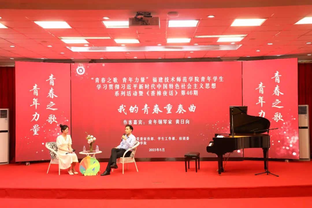 5月30日下午,我院协办的“青春之歌 青年力量”福建技术师范学院青年学生学习贯彻习近平新时代中国特色社会主义思想系列活动在五马山校区科学楼学术报告厅启动,特邀青年钢琴家、施坦威艺术家黄日向博士作客校园文化品牌活动《香樟夜话》,与青年大学生共话青春与奋斗。校党委副书记林海峰出席现场,校党委宣传部陈小红部长、学生工作部林钦松部长、校团委吴蔚平副书记、教育学院郑向峰副书记和师生代表参加了有关活动。