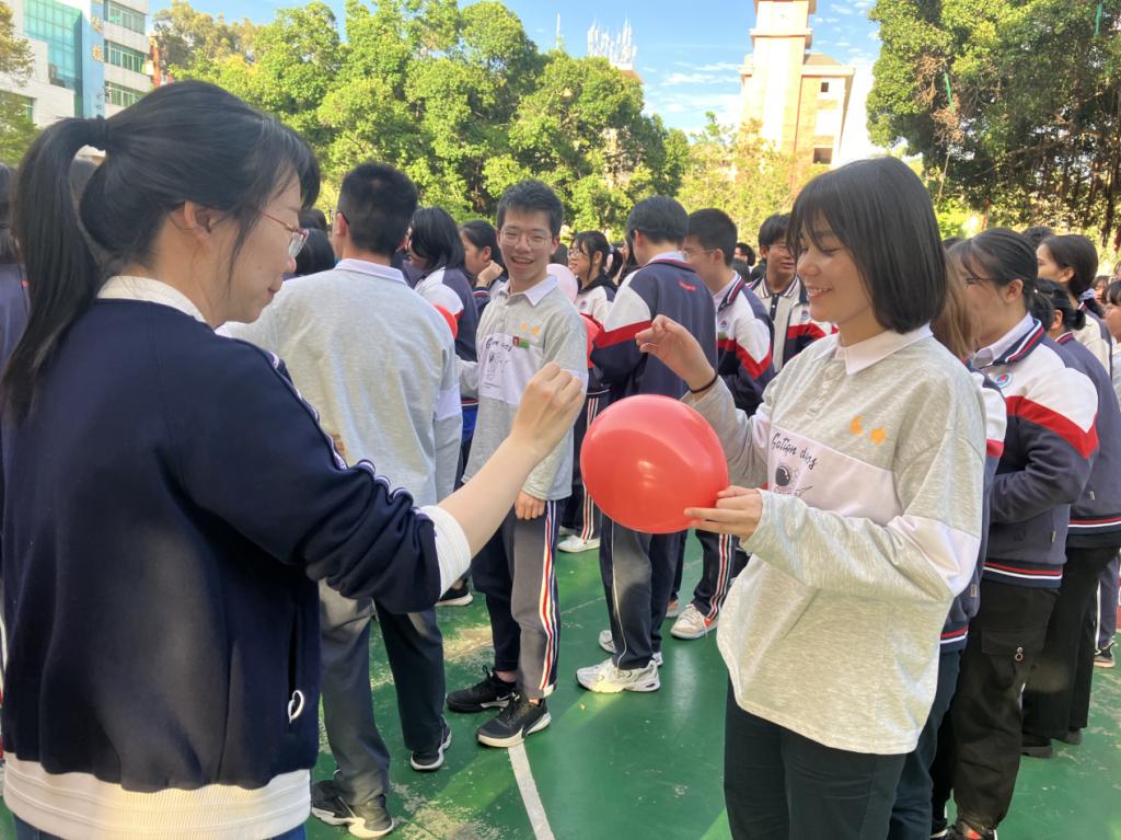 活动以“幸福齐拍手”作为暖身整队环节开场,伴随着音乐节奏的律动充分调动学生热情,活跃了整体氛围。紧接着通过“爆破压力球”与“勇往风火轮”等趣味活动让同学们释放压力,感受竞争与合作的魅力。游戏不断进行,操场上洋溢着同学们的欢声笑语,不知不觉中都得到了放松。最后,同学们在衣服上互相留言鼓励,送上最真诚的祝福。