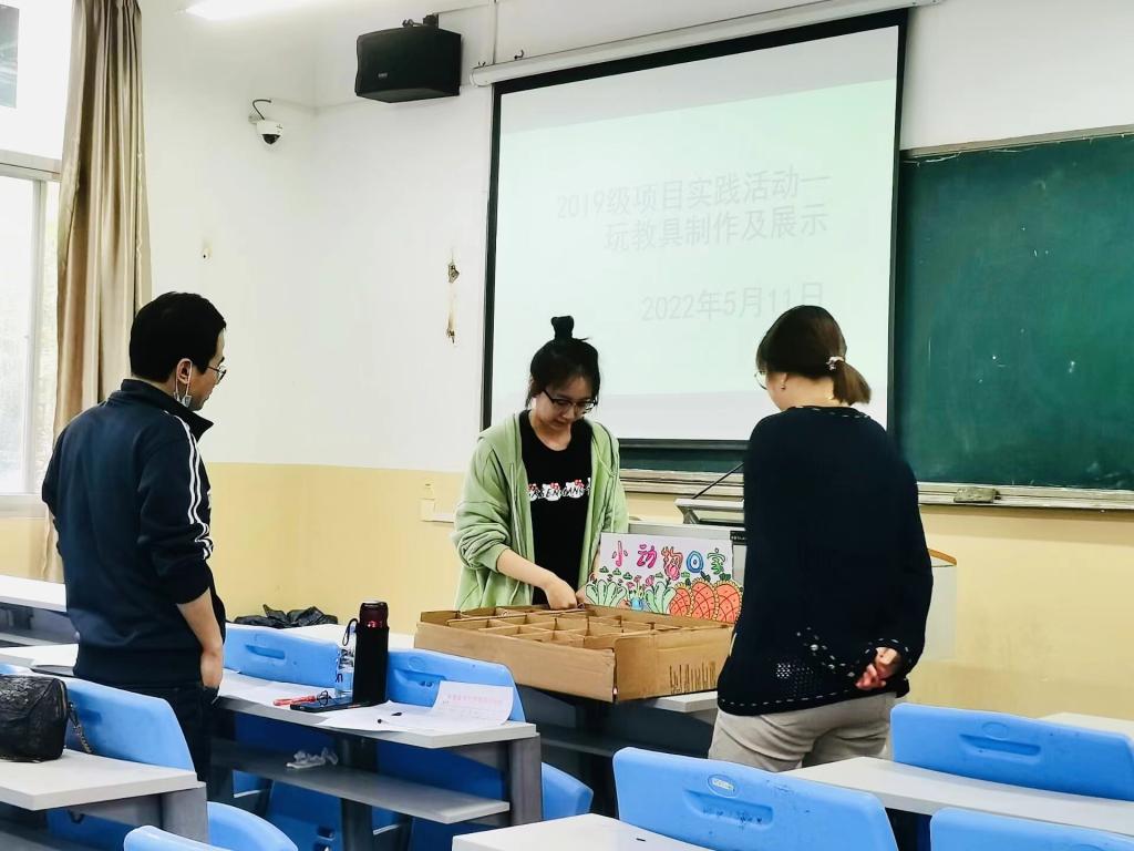 5月11日下午,在石竹校区J1教学楼,我院组织学前教育专业2019级全体137名学生参加玩教具制作与展示考核。考核分为4个小组同时进行,学前教育专任教师进行现场评分。每位学生根据自己制作的教玩具作品,围绕其适用设计意图、材料、玩法、价值等方面进行了3-5分钟的作品介绍,并现场回答问题。