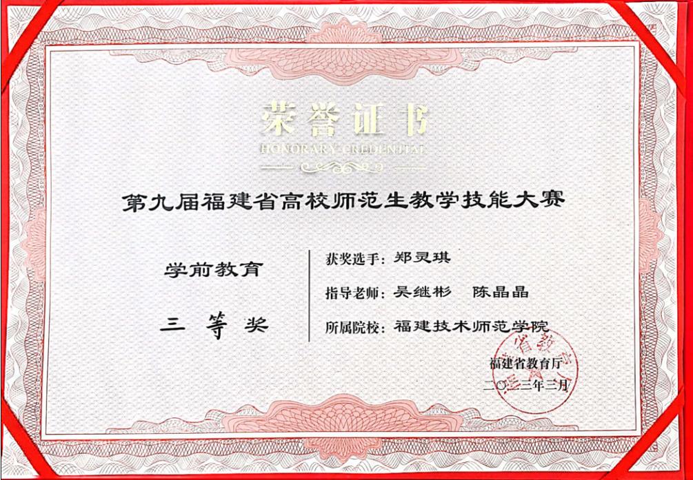 近日,第九届福建省高校师范生教学技能大赛在闽南师范大学落下帷幕,全省共有32所高校249位选手参与此次竞赛。经过激烈角逐,我院学子郑灵琪同学在比赛中荣获学前教育组三等奖。指导教师为吴继彬和陈晶晶老师。