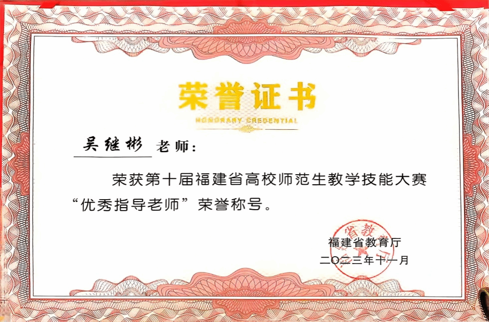 11月24-26日,由福建省教育厅主办的第十届省高校师范生教学技能大赛决赛在宁德师范学院举行,全省共有36所高校230名选手参加了此次竞赛。其中学前教育组共有48名参赛选手分三组进行比拼。大赛从教学设计、模拟课堂教学和专家提问三个环节进行综合考核。经过激烈角逐,我院2022级专升本2班江清霞同学在比赛中脱颖而出,荣获学前教育组一等奖的优异成绩。吴继彬老师被评为优秀指导老师。