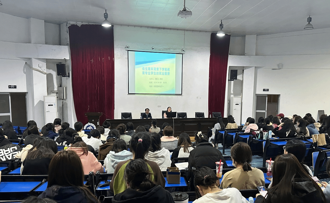 4月8日晚,我院学前教育专业副主任魏红心博士在五马山校区向高园报告厅一作题为《低生育率背景下学前教育专业学生的就业前景》的专题讲座。讲座由学前教育专业主任朱毅德主持,学前教育专业师生参会。