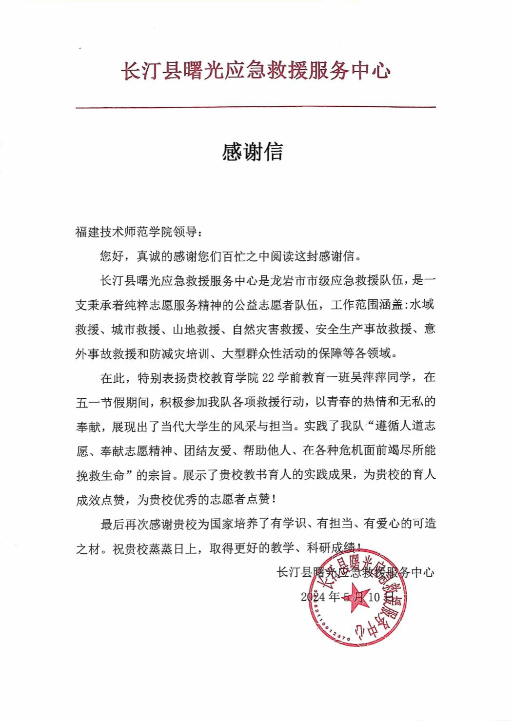 近日,我院收到一封落款为长汀县曙光应急救援服务中心的感谢信。信中写到,我院22学前教育一班吴萍萍同学在五一节假日期间,积极参与到该组织的救援、巡逻等志愿服务,参加各项救援行动,践行志愿者精神。跟随救援队一起上山寻找走丢的老人;在县城人流量较多的地方巡逻站岗,给需要帮助的游客提供帮助等,以青春的热情和无私的奉献,展现出了当代大学生的风采与担当,用实际行动深刻诠释了“奉献、友爱、互助、进步”的志愿者精神,彰显了青春风采。