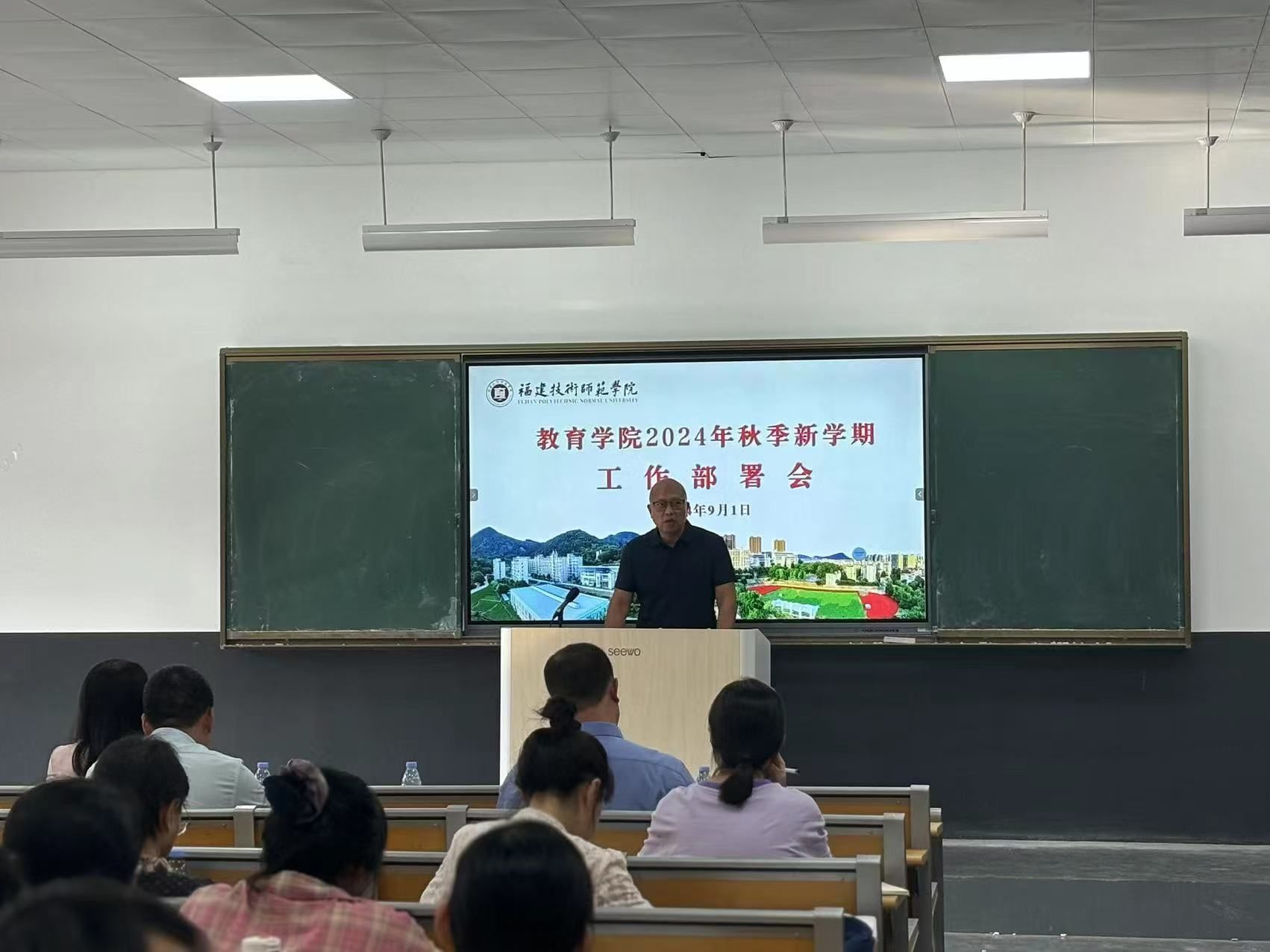 副院长(主持工作)陈妮娅就学院的制度建设、人才引进、就业指导、学科竞赛以及本科教学评估准备工作等情况作了通报。她表示,学院上半年以来各项工作能够取得较好成效离不开学院全体老师的支持和不懈努力,同时也对本科教学评估暑期坚持工作在一线的全体同仁表示感谢,并对新学期工作做了部署。她强调,教师们应围绕学院硕士点培育建设、职业教育、应用型学科建设及本科教学评估等中心工作,继续努力推进迈上新台阶;学院的教学、科研、学生管理等各项工作应按照学校既定的规则和标准执行,以确保学院工作的有序和高效,提升教育质量和管理水平;教师们应以饱满的热情上好新学期的第一堂课。
