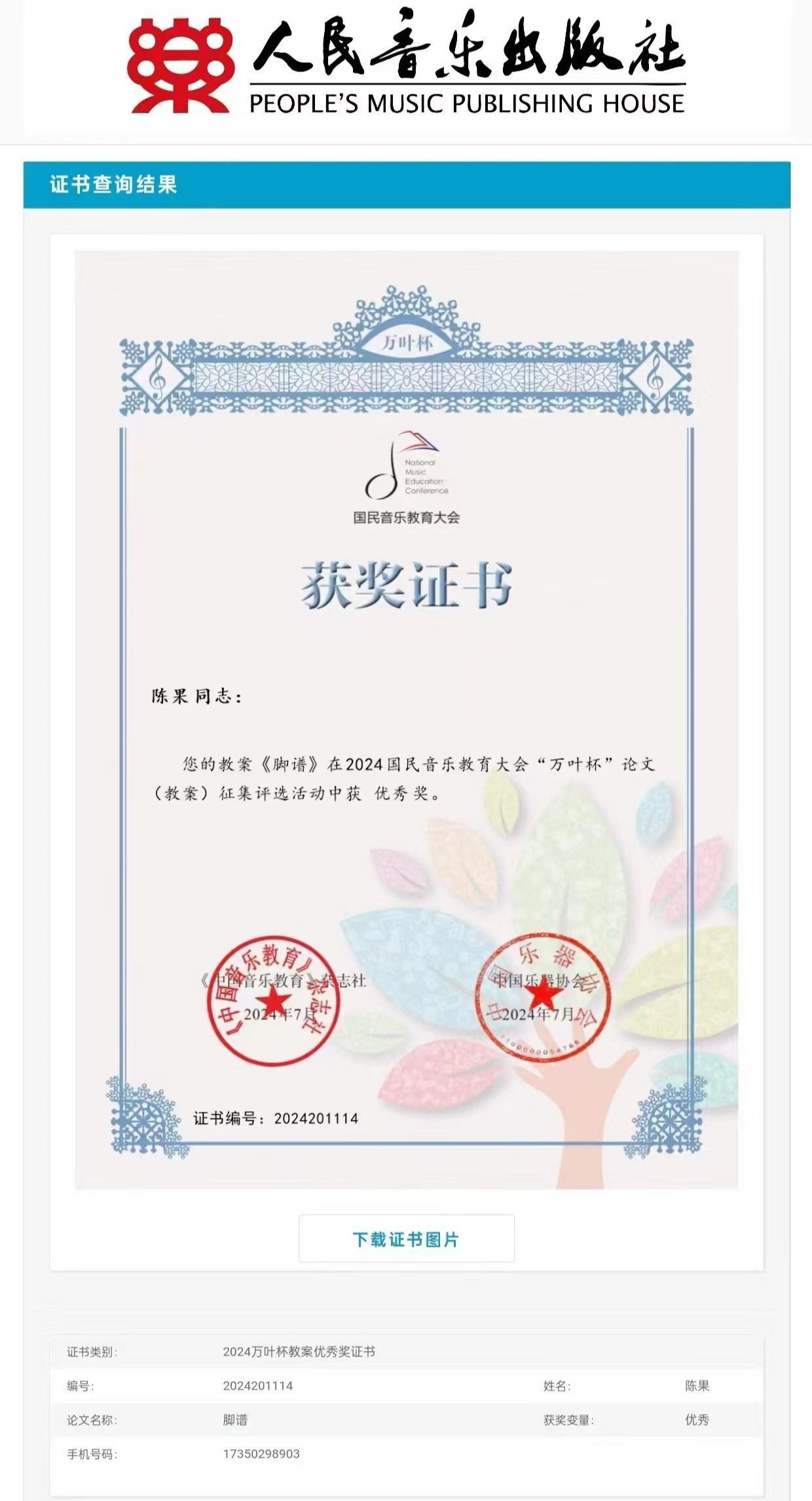 2024年9月6日,国民音乐教育大会“万叶杯”论文(教案)征集评选活动获奖名单揭晓。我院2023级学前教育专业1班陈果同学的教案《脚谱》在众多参赛作品中脱颖而出,荣获优秀奖。