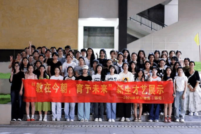 为提升学前教育专业新生专业素养,激发学生对学前教育专业技能兴趣。9月18日晚,我院在鼎新广场举办“教在今朝 育予未来”新生才艺展示。2024级学前教育新生参加活动。