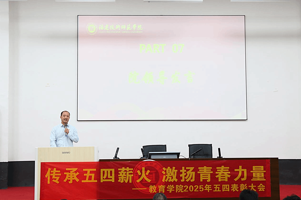 教育学院副院长胡剑锋作总结讲话,他代表学院向受到表彰的先进集体和优秀个人表示最热烈的祝贺,向一直以来为学院发展、为青年成长默默奉献的全体师生致以最崇高的敬意和最诚挚的感谢。并寄语全体青年学子以五四精神为指引,勇担时代重任。一要要坚定理想信念,筑牢信仰之基;二要勤奋学习钻研,提升能力本领;三要勇于创新创造,激发青春活力;四要锤炼品德修为,弘扬文明新风。