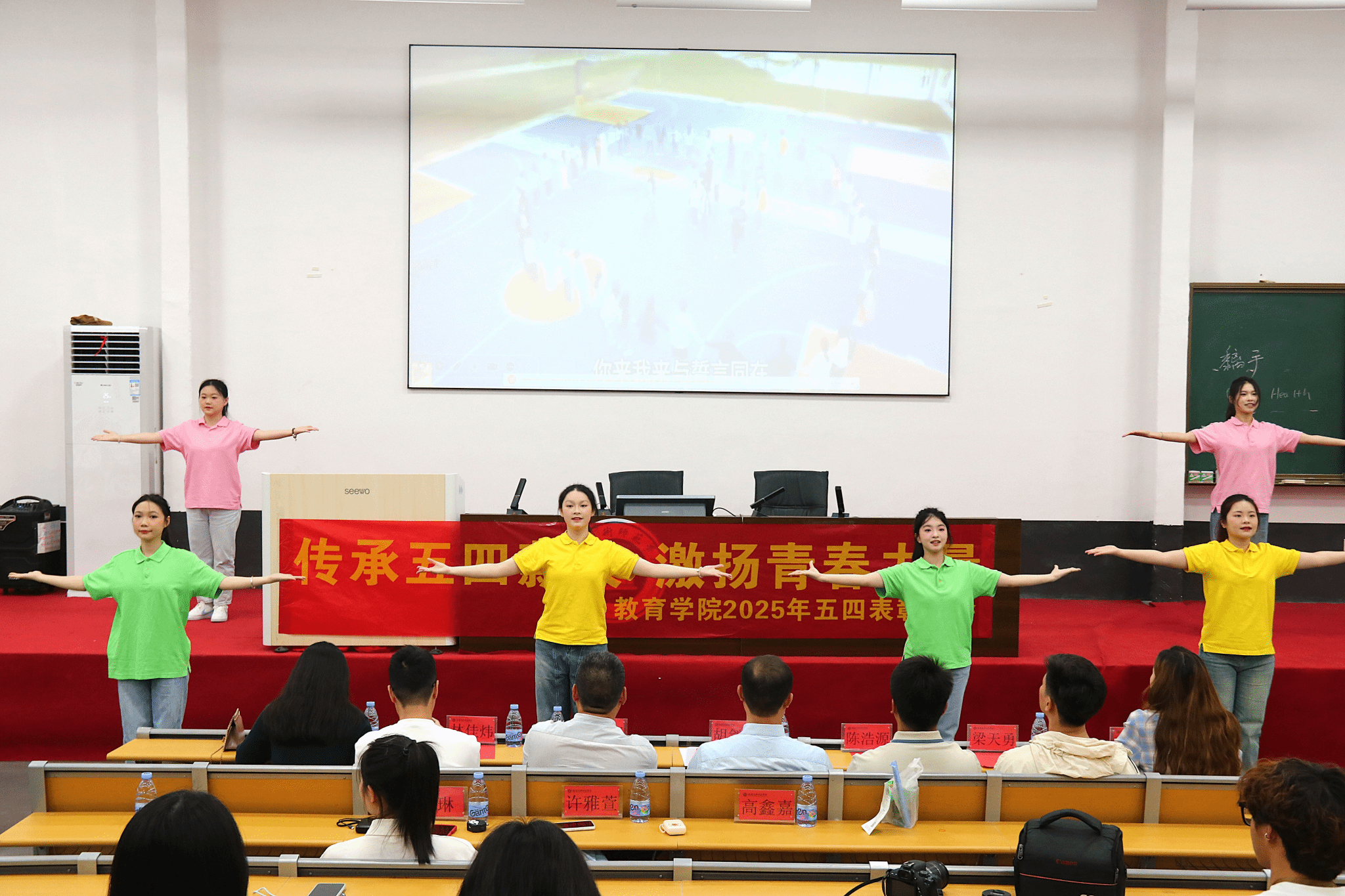大会在激昂的国歌声中拉开序幕。开场舞蹈表演《以青春的名义》展现了教育学院学子朝气蓬勃的精神风貌,赢得了现场阵阵掌声。紧接着,全体与会人员共同观看了五四运动宣传片,重温了那段波澜壮阔的历史,进一步坚定了青年学子的理想信念。