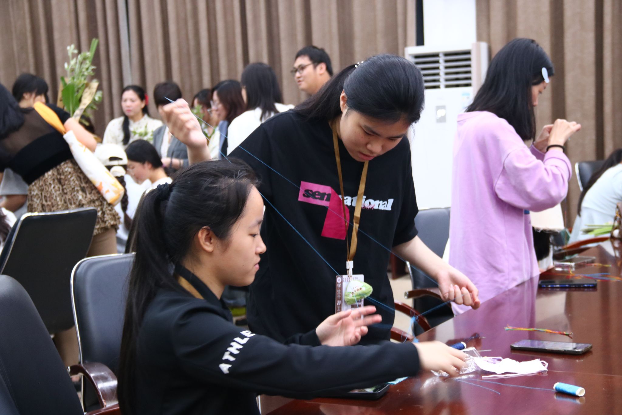 端午手作DIY区则成为了创意与技艺的展示舞台。这里有香囊缝制、五彩绳编织、艾草菖蒲花束制作等丰富的非遗手作项目。师生们充分发挥自己的想象力和创造力,精心挑选材料,巧妙搭配色彩,制作出了一件件精美的手工作品。小小的香囊不仅散发着淡淡的草药香气,更承载着人民对美好生活的向往;五彩绳编织成的手链、挂饰,艾草菖蒲制作成的精美花束,寓意着驱邪避灾、平安顺遂。