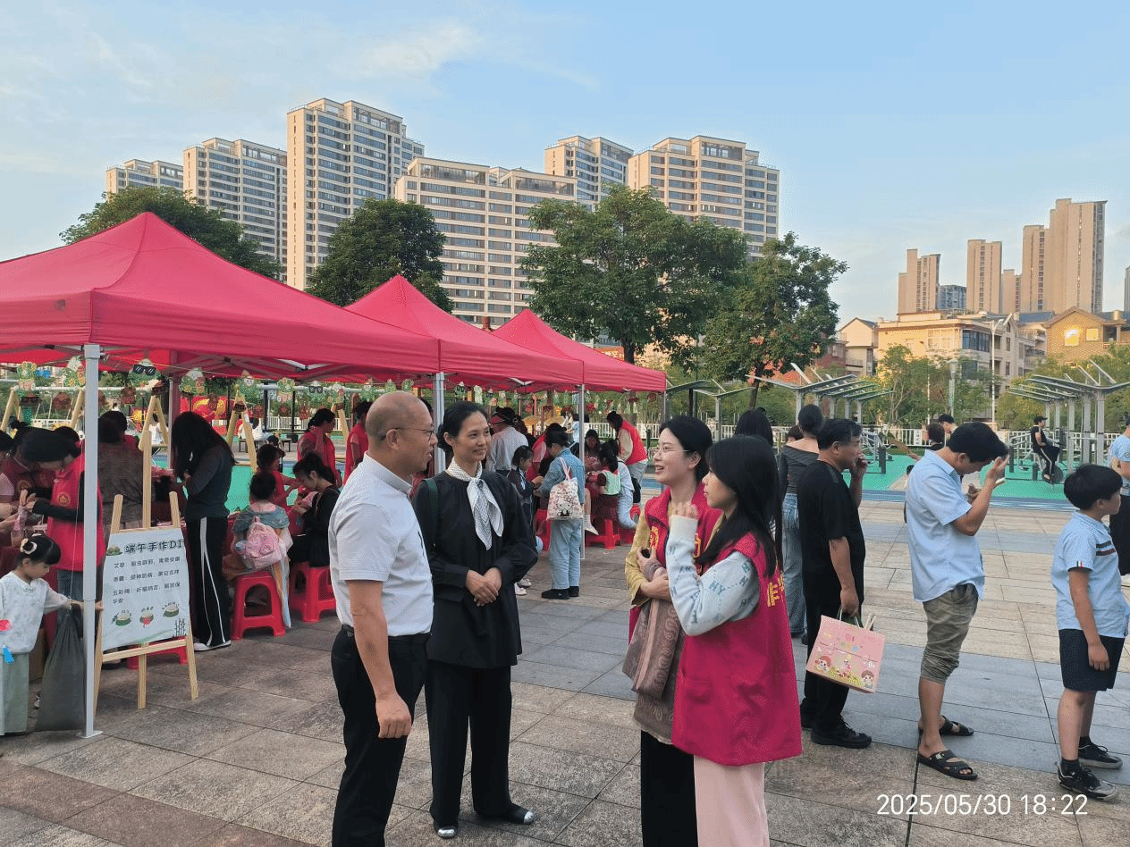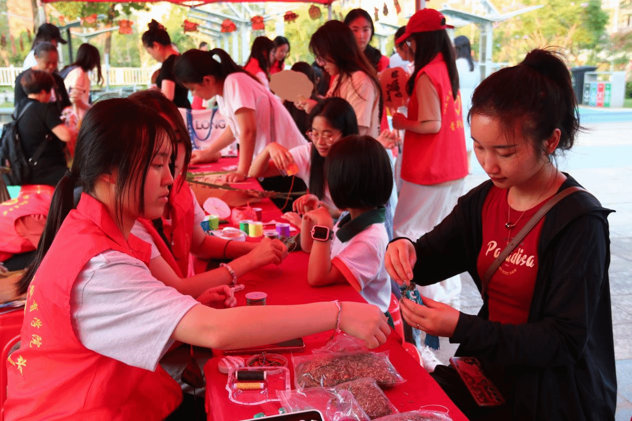 非遗技艺区人气高涨:我院学生志愿者化身“传承使者”,引导市民巧手包裹情意粽,缝制驱疫香囊,组合清雅艾草菖蒲花束,并编织吉祥五彩绳。青翠粽叶与清香艾草的气息弥漫全场,让非遗工艺在指尖焕发时代生命力。