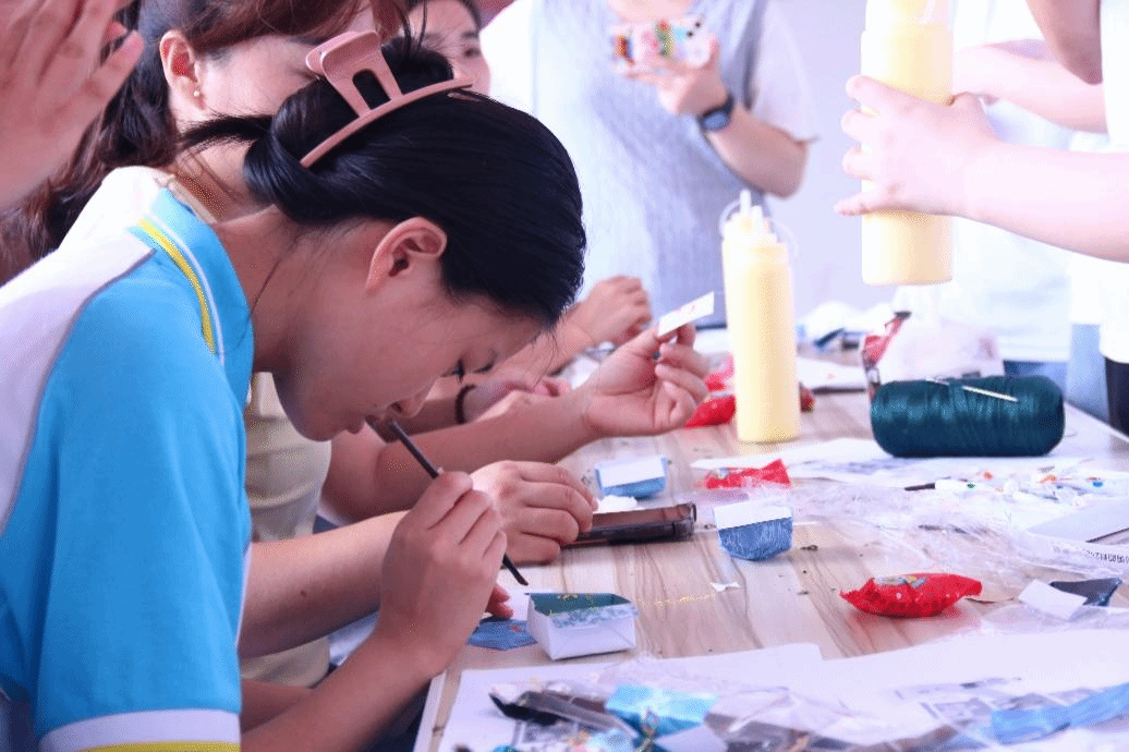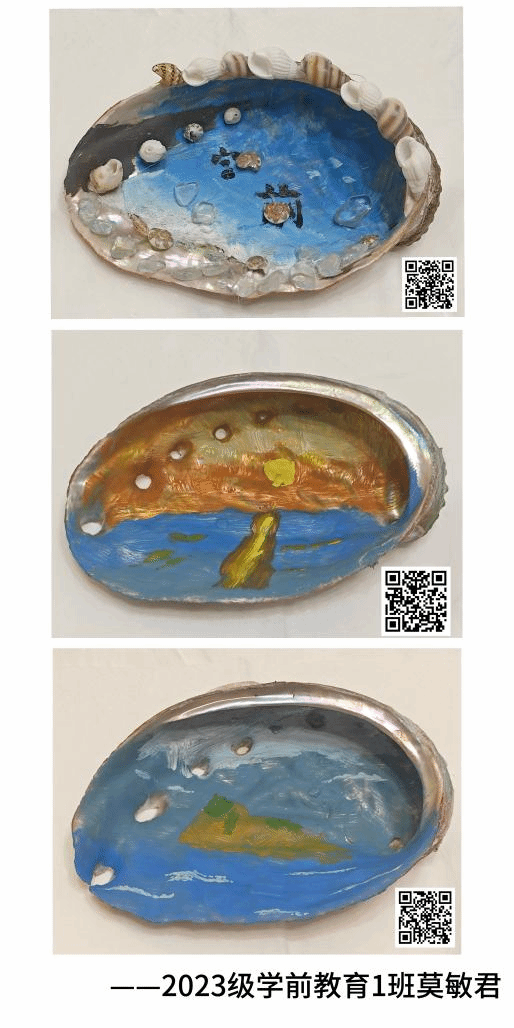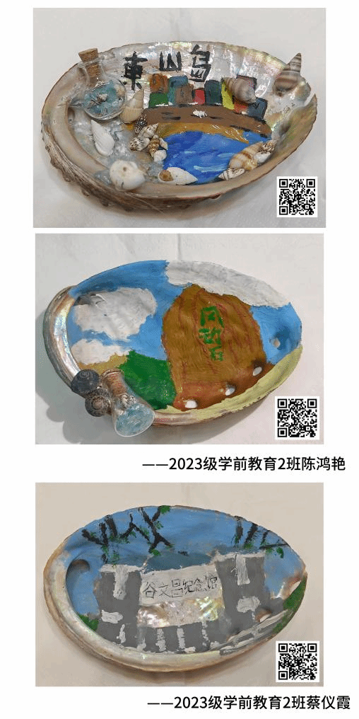 实践队立足东山红色文化资源,学前教育专业队员们将鲍鱼养殖场里的废弃鲍鱼壳变废为宝,以“红色地标 + 生态美学”为理念开展“鲍鱼壳绘东山”行动。他们用矿物颜料在壳上绘出谷文昌纪念馆等6幅东山岛红色地标与生态景观作品。随后,队员们带着这些“会说话的文创”来到岱南村,向村民展示,让红色文化以鲜活姿态走进大众视野。