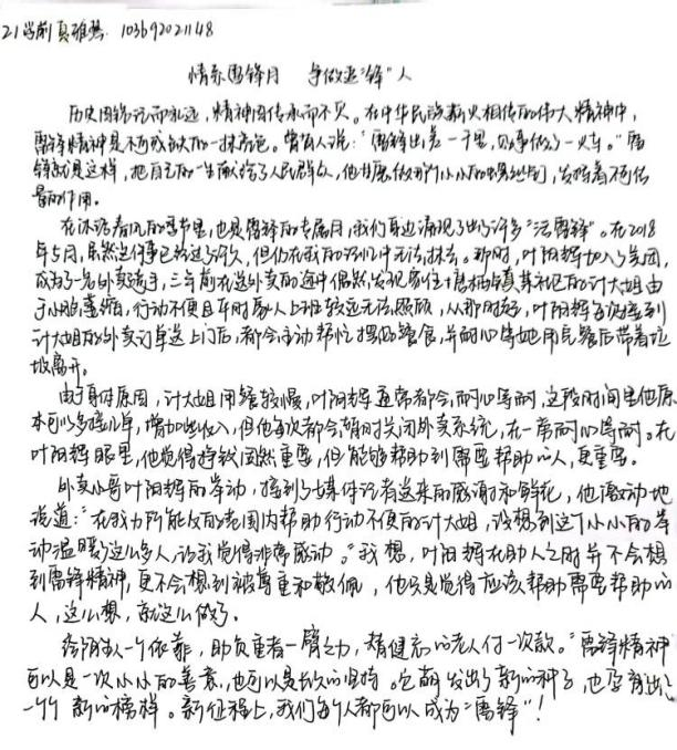 雷锋精神是我们都应该学习的精神,应把雷锋精神弘扬到全世界。要学习雷锋对待事业的态度,学习雷锋刻苦学习的钉子精神,学习雷锋关心人、爱护人、支持人、理解人的品质。学习雷锋好榜样,这句传唱数十年的歌词如今落到了我们身上。短短的三月已快要结束,然而,我们学习雷锋的脚印不会因为雷锋月的结束而停止。因为不论在什么背景和时代,雷锋都代表着人类的高尚和心灵之美,是一种发自内心的爱。