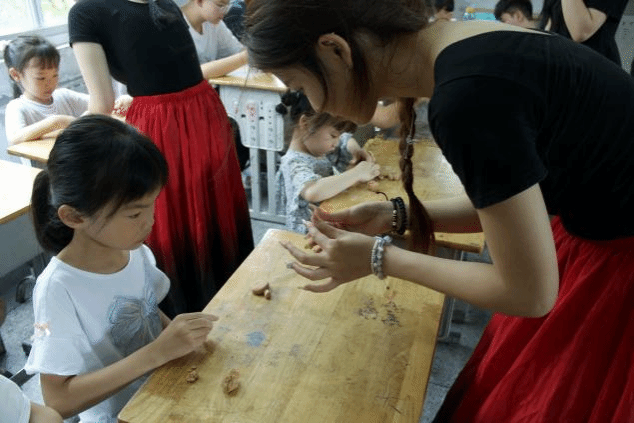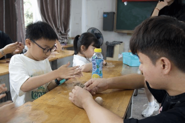 7月8日,实践队走进当地溪口小学和红苹果幼儿园举办了一场特殊的党纪学习教育—手工艺展示和创作。家政学专业的队员们充分发挥专业特长,为小朋友们举办了一场红色书法艺术展示和中医技艺宣传。