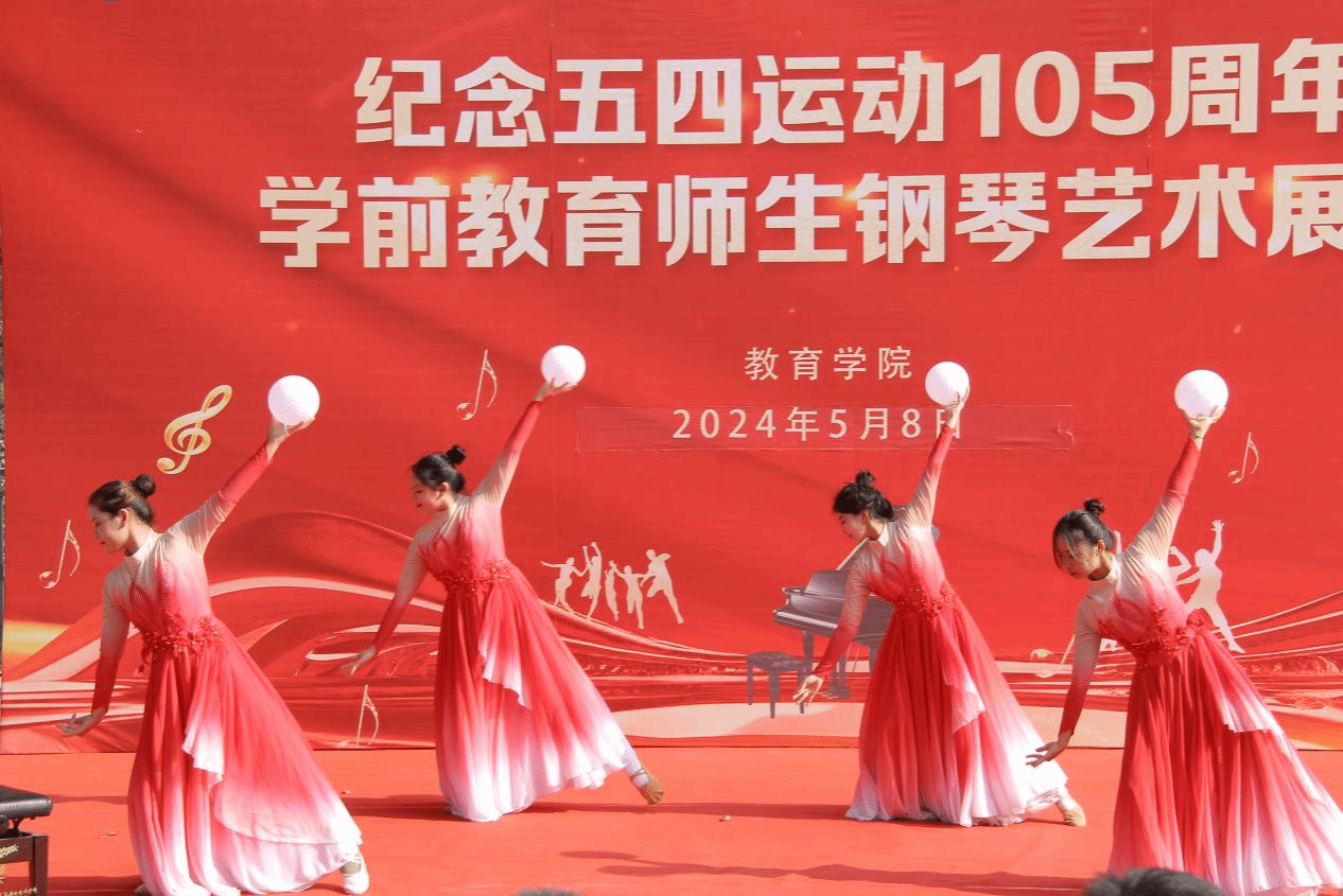本次钢琴艺术展演以“五四传薪火,青春献乐章”为主题,以钢琴弹奏为主线,穿插融合独唱、舞蹈、合唱、朗诵等环节,带领现场观众穿越世纪风云,追寻百年峥嵘岁月,引领青年担当时代使命,为实现中华民族伟大复兴砥砺前行。参演师生精湛的琴技、动人的歌声和优美的舞姿,赢得了现场观众的阵阵掌声。合唱《同一首歌》刻画了中华民族团结奋斗的最大同心圆;独奏《庆翻身》表达了人民翻身做主得解放的喜悦之情;琴伴舞《万疆》传达了对祖国万里山河的无限赞美和深情表白;独奏《山丹丹开花红艳艳》倾注了对党的无限热爱和感恩之情;舞蹈《灯火里的中国》展现了中国万家灯火、安详宁静的繁华盛世;四手联弹《保卫黄河》激发了中华儿女保家卫国的勇气和决心;独唱《有我》展示青年牢记使命、不畏险阻的时代担当……
