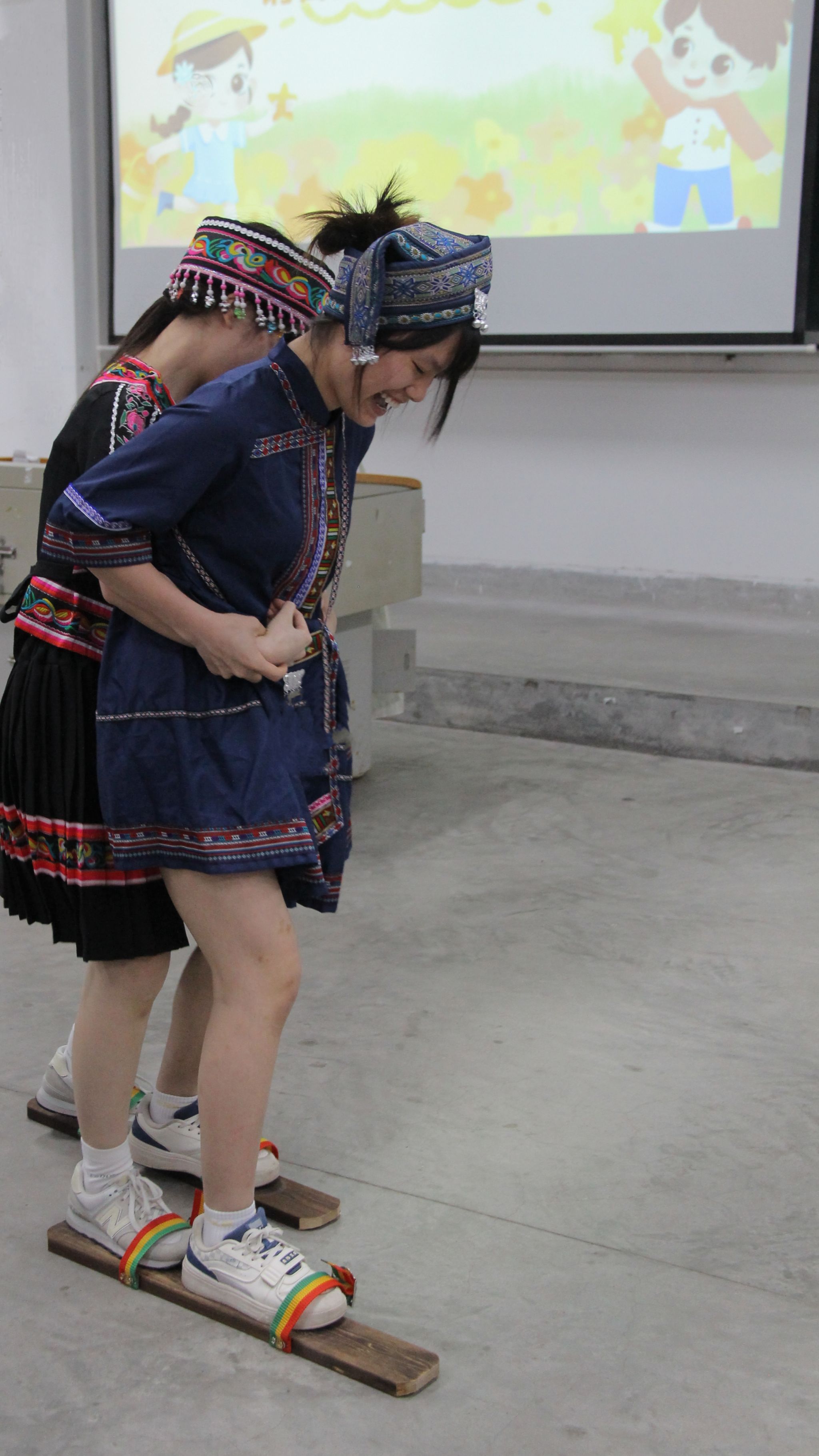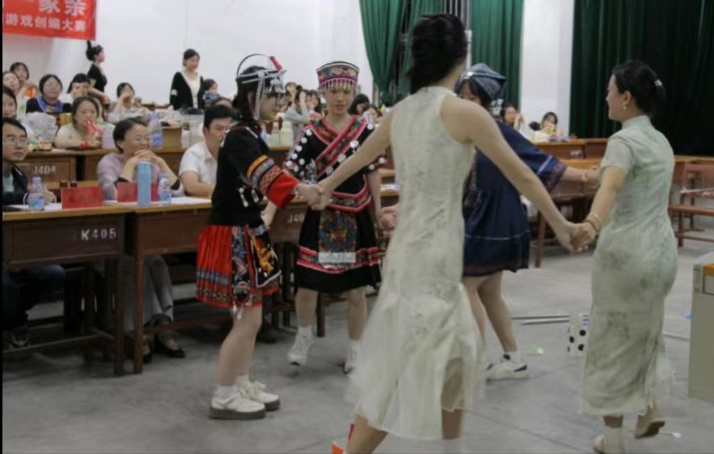 在比赛现场,参赛选手们热情洋溢地展示了他们精心创编的民间游戏,这些游戏不仅蕴含各民族特色传统文化,而且巧妙地与学前儿童的年龄特征与发展需要相结合,具有丰富的教育价值,在道具、服装、配乐等方面充分展示我国各民族的文化魅力。活动过程中,同学们情绪高涨,积极投入,将我国民间游戏中蕴含的崇智尚勤、集体协作的价值观内化并通过幼儿游戏活动的设计与组织实施加以传承。