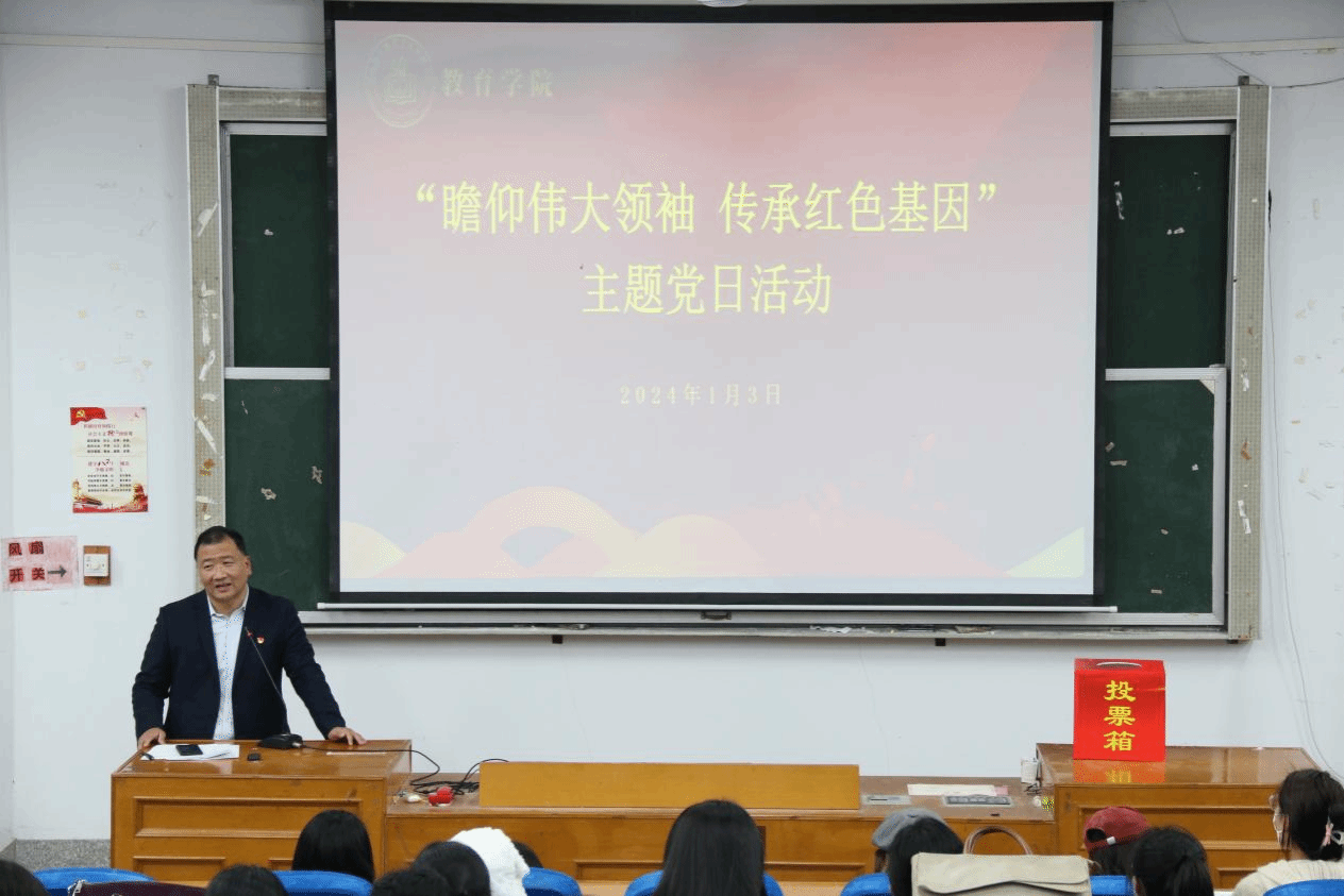 为学习贯彻习近平总书记在纪念毛泽东同志诞辰130周年座谈会上的重要讲话精神,1月3日下午,我院在五马山校区教学楼201开展“瞻仰伟大领袖,传承红色基因”主题党日活动,学院全体师生党员参加了活动。