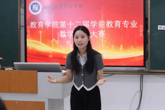 本次比赛面向2026届学前教育专业毕业生,共有12位选手入围决赛。比赛严格参照省赛流程及评分标准,共分为教学设计、模拟课堂教学和专家提问等3个环节,多维度考察选手的学科素养和教学实践能力。选手们在赛场上以扎实的专业素养与灵动的教学创意,呈现了一场高质量的教学技能比拼,赢得了评委的一致认可,在这一过程中充分彰显了新时代学前教育师范生的专业潜力。