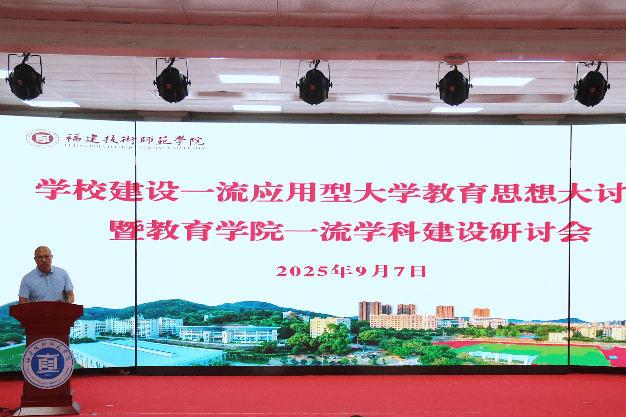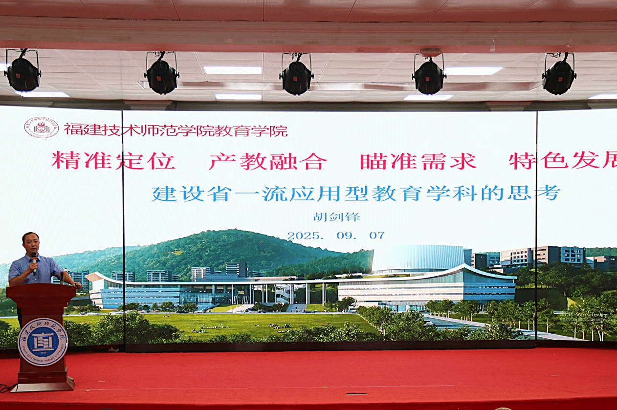 副院长(主持工作)胡剑锋作题为《精准定位 产教融合 瞄准需求 特色发展——建设省一流应用型教育学科的思考》的主题报告。他深入分析了高等教育与师范教育面临的六大挑战,剖析了学院和学科的现状及问题所在,强调要紧跟学校建设一流应用型大学的目标,以获批教育专业硕士学位授权点为核心任务,推动人才培养改革,开展有组织的科研,优化管理服务方法,建成以职业技术教育为特色的省内一流应用型学科,成为助力学校职教师资培养和高质量发展的重要力量。并围绕“锚定‘第三高地’目标,强化职教研究,打造职业教育的 ‘福建高地’;发挥‘两个唯一’优势,建设家政学科,打造家政领域的‘人才摇篮’;面向‘一老一小’需求,深化校地合作,打造终身教育的‘典型样板’”三个目标,从人才培养、专业建设、学科发展、工作机制等方面提出具体要求。