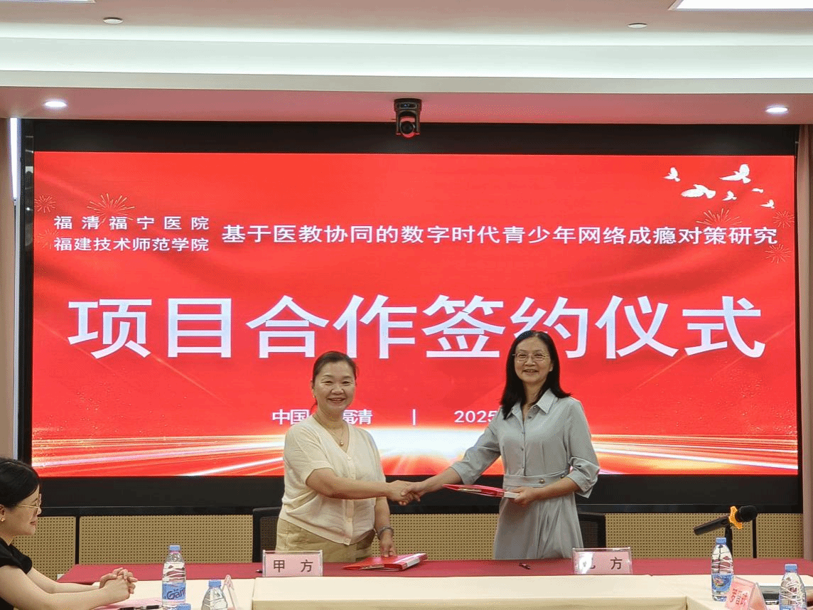 仪式上,胡剑锋副院长指出,青少年网络成瘾已成为一个不容忽视的社会问题,不仅影响青少年的身心健康,还对其学业、家庭关系乃至未来发展产生深远影响。学院历来高度重视服务地方和社会发展,此次与福清福宁医院的合作,正是基于双方对青少年健康成长的共同关注,通过医教协同的模式,将专业的医疗资源与高校的教育资源有机结合,更科学、更有效地探索和解决青少年网络成瘾问题。后续学院将依托师资团队及科研平台,围绕多维度展开项目重难点攻关,秉持 “理论落地、服务社会” 宗旨打造青少年网络成瘾防治新模式。