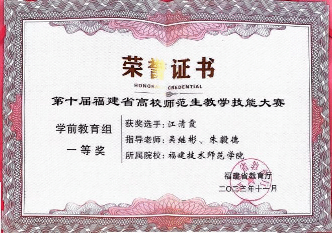 11月24-26日,由福建省教育厅主办的第十届省高校师范生教学技能大赛决赛在宁德师范学院举行,全省共有36所高校230名选手参加了此次竞赛。其中学前教育组共有48名参赛选手分三组进行比拼。大赛从教学设计、模拟课堂教学和专家提问三个环节进行综合考核。经过激烈角逐,我院2022级专升本2班江清霞同学在比赛中脱颖而出,荣获学前教育组一等奖的优异成绩。吴继彬老师被评为优秀指导老师。