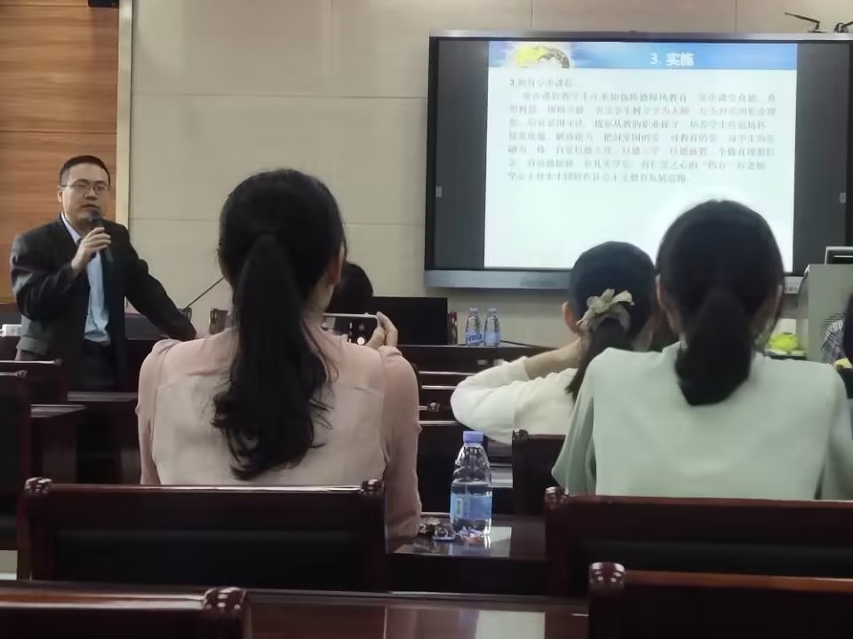 赵少卡副院长从“课程思政”的“缘起”“内涵”“实施”“应用”四个部分对课程思政的理论及实践进行深入的阐述;并从教师、课程、专业和学生层面对“课程思政”建设现状和提升方向进行了全面梳理。他运用思政教育理论与实践、知行合一的原则,结合自己多年教学经验,分析了如何将课程思政融入教学,并推荐“课程思政”实施的“六步走”基本方法和技巧。整场讲座内容充实、语言生动、感情真挚,老师们认真听讲,做好笔记,学习讨论气氛十分热烈。