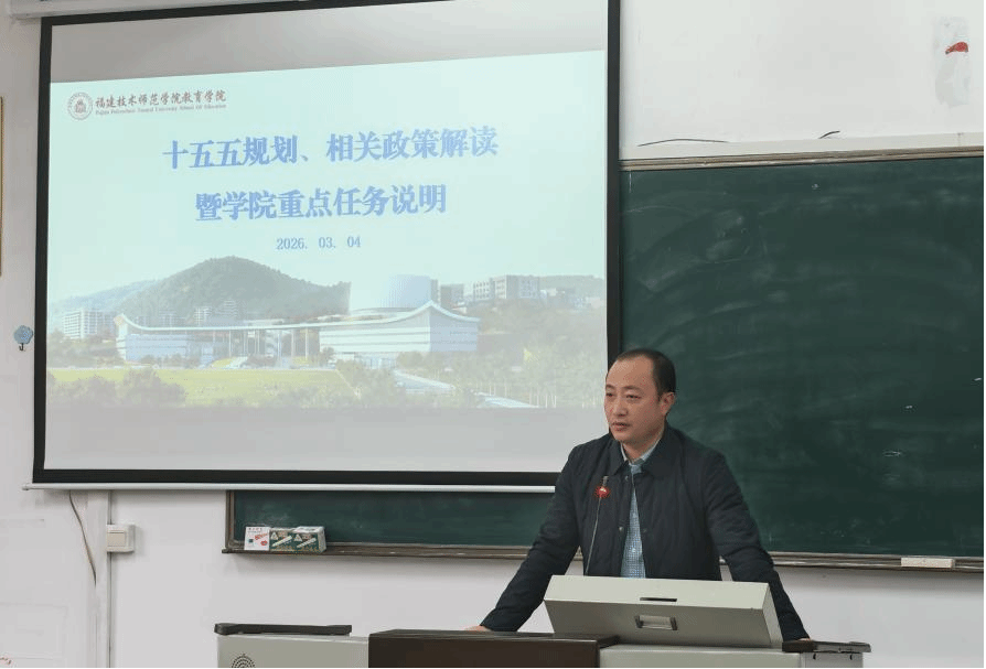 胡剑锋副院长(主持工作)结合学院实际对《中共中央关于制定国民经济和社会发展第十五个五年规划的建议》和《教育强国建设规划纲要(2024—2035年)》进行了解读,做了行政工作部署。强调教师们应锚定国家发展战略,跟紧学校发展步伐,围绕人才培养改革、硕士点建设、师范专业认证,学科团队建设、科研成果产出、绩效改革、毕业生和招生工作等重点任务,科学、有序、高效推进学院内涵建设。