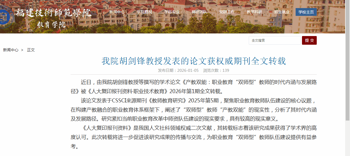 3.近几年来,中心成员主持各级各类纵向科研项目20余项,横向科研项目20余项,在本科学报以上级别的学术期刊上发表闽台职业教育相关研究论文共50余篇,其中CSSCI等权威核心期刊发表近10篇;2026年,胡剑锋教授等撰写的论文《产教双能:职业教育“双师型”教师的时代内涵与发展路径》被《人大复印报刊资料·职业技术教育》2026年第1期全文转载。
