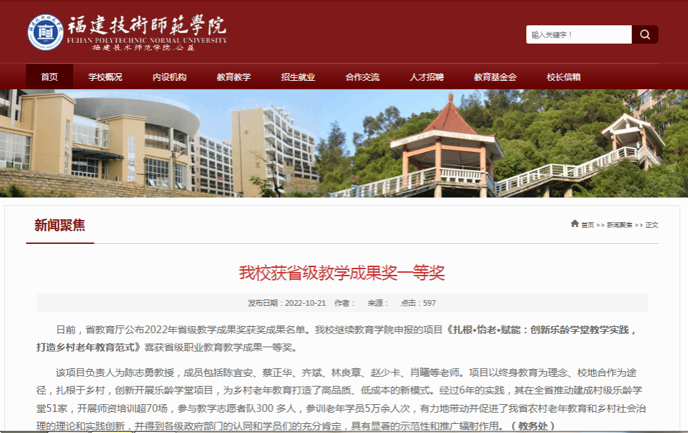 2.在调研基础上完成“福建二元制技术技能型人才培养成效研究报告”。2021年,中心成员撰写的《福建乡村乐龄学堂办学模式研究报告》等共6项决策咨询被采纳;2022年,《扎根.怡老.赋能:创新乐龄学堂教学实践,打造乡村老年教育范式》项目获省级职业教育教学成果一等奖;2024年9月,胡剑锋教授在第十届全国职业教育新思维博士论坛做《构建与新质生产力相适应的高等职业教育产教融合体系》主旨报告;2025年10月,参加“第三届东北地区职业教育发展论坛”并做《人口老龄化:职业教育为何与何为》专题报告。